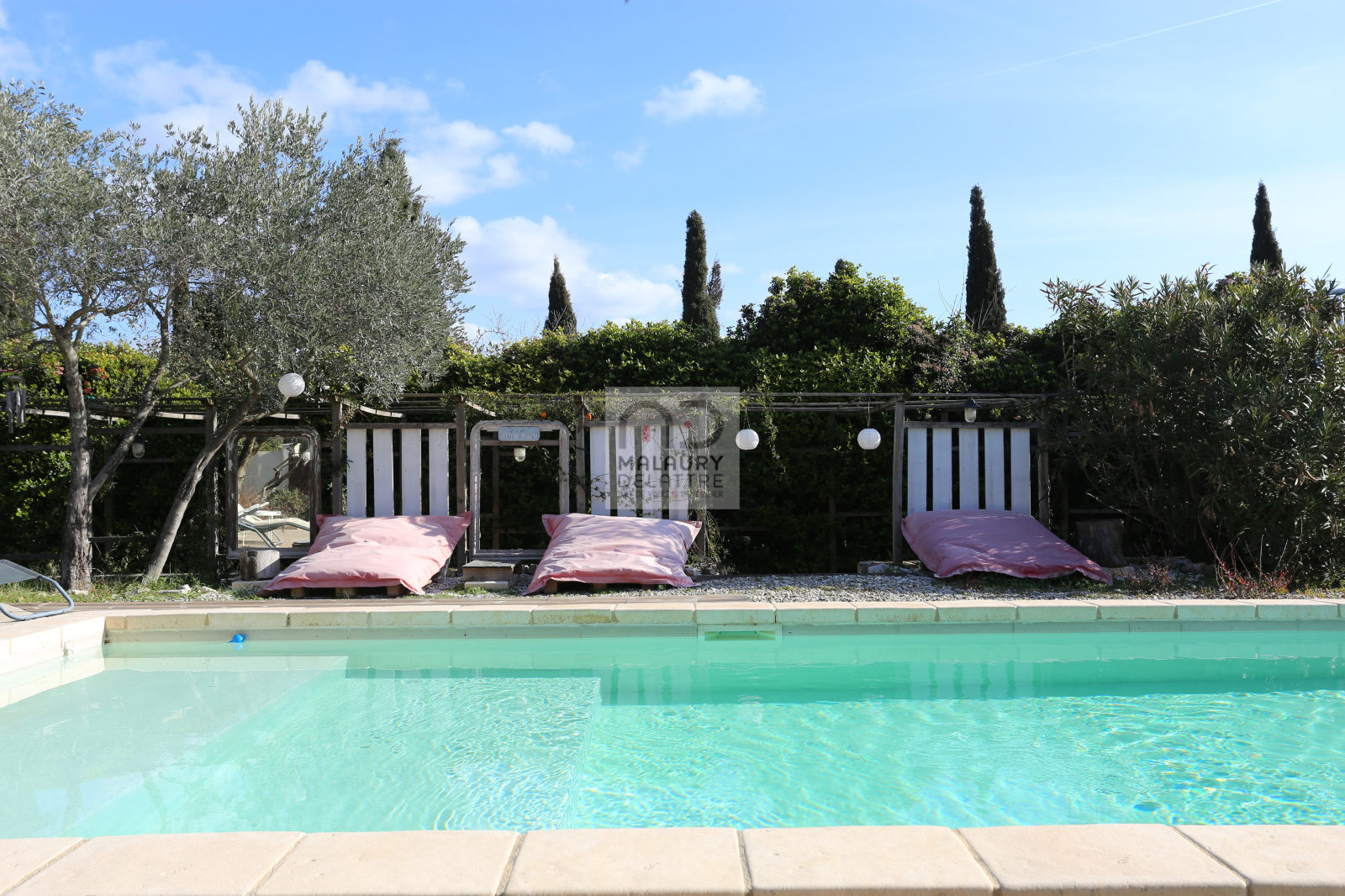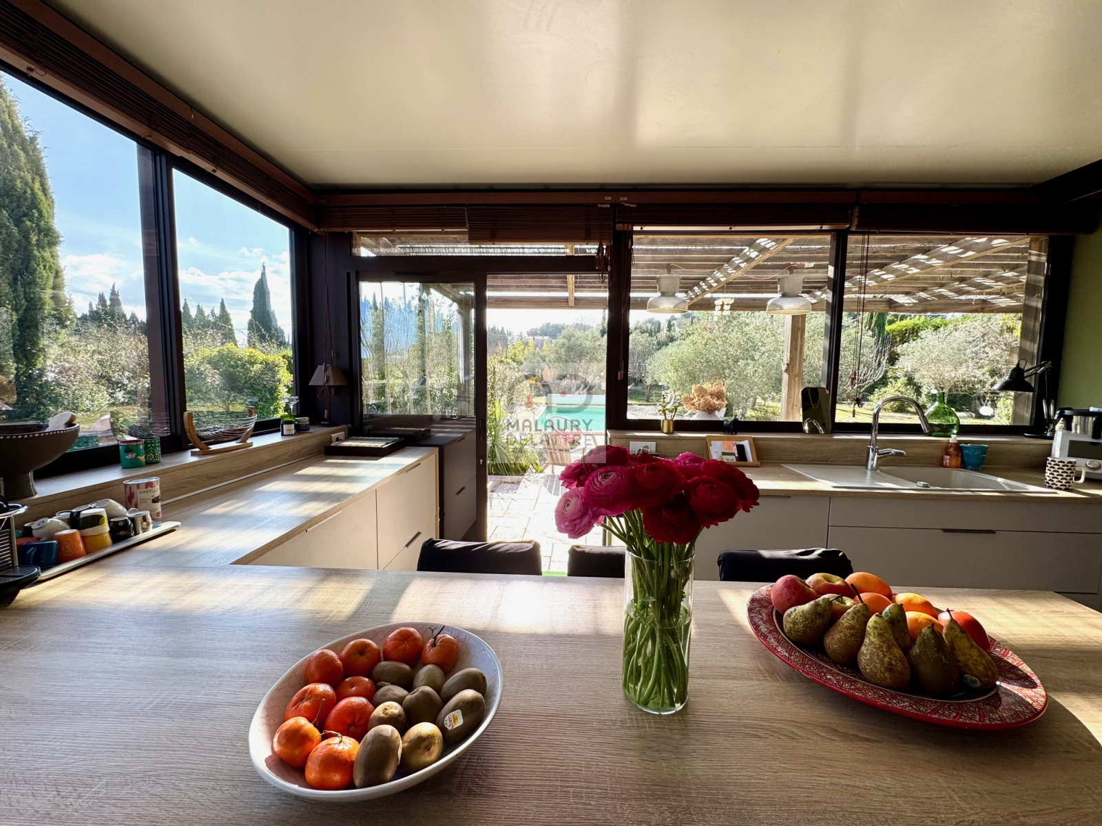 Edifiée sur un superbe terrain plat et arboré de 2853 m², exposée sud, elle profite d'une très agréble vue dégagée sur son jardin arboré d'oliviers, d'amandiers et sur l'espace piscine. Lorsque vous serez dans la maison vous aurez l'impression d'être connectés au jardin !