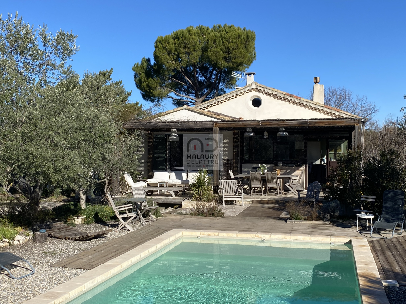 Edifiée sur un superbe terrain plat et arboré de 2853 m², exposée sud, elle profite d'une très agréable vue dégagée sur les oliviers, sur l'espace piscine ainsi que sur la nature environnante. Lorsque vous serez dans la maison vous aurez l'impression d'être connectés au jardin !